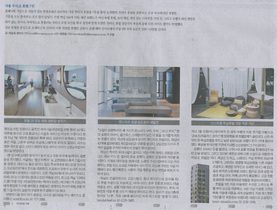 1층 입구에 오래된 영사기가 놓여 있고 호텔 곳곳에 슬레이트·필름 등을 전시했다. 객실에는 ‘빨간 마후라’ 등 고전영화의 흑백 스틸사진을 걸었다. 서비스도 좋은 편이다. 모든 투숙객에게 레스토랑 ‘쓰리버드 트라토리아’에서 조식을 제공한다. 프로듀서 양현석 소유의 YG리퍼블릭에서 운영하는 식당이다. 모든 객실(80개)의 미니바가 무료다. 어메니티는 더 화이트 컴퍼니 런던 제품을 쓴다. 최고급 객실 ‘디렉터스 룸’(주중 기준 1박 88만원)에는 럭셔리 브랜드 에르메스가 신영균씨에게 헌정한 가구를 배치했다. 호텔28은 세계적인 럭셔리 독립 호텔 연합 ‘스몰 럭셔리 호텔’의 유일한 한국 회원이기도 하다.